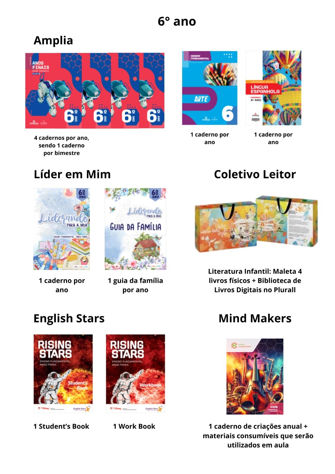 AMPLIA: 4 CADERNOS POR ANO (SENDO 1 CADERNO POR BIMESTRE) + 1 CADERNO DE ARTE POR ANO + 1 CADERNO DE LÍNGUA ESPANHOLA POR ANO + 1 LIVRO DE DESENHO GEOMÉTRICO