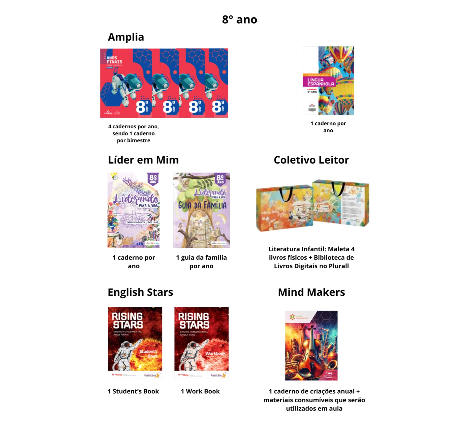 AMPLIA: 4 CADERNOS POR ANO (SENDO UM CADERNO POR BIMESTRE) + 1 CADERNO DE LÍNGUA ESPANHOLA POR ANO + 1 LIVRO DE DESENHO GEOMÉTRICO