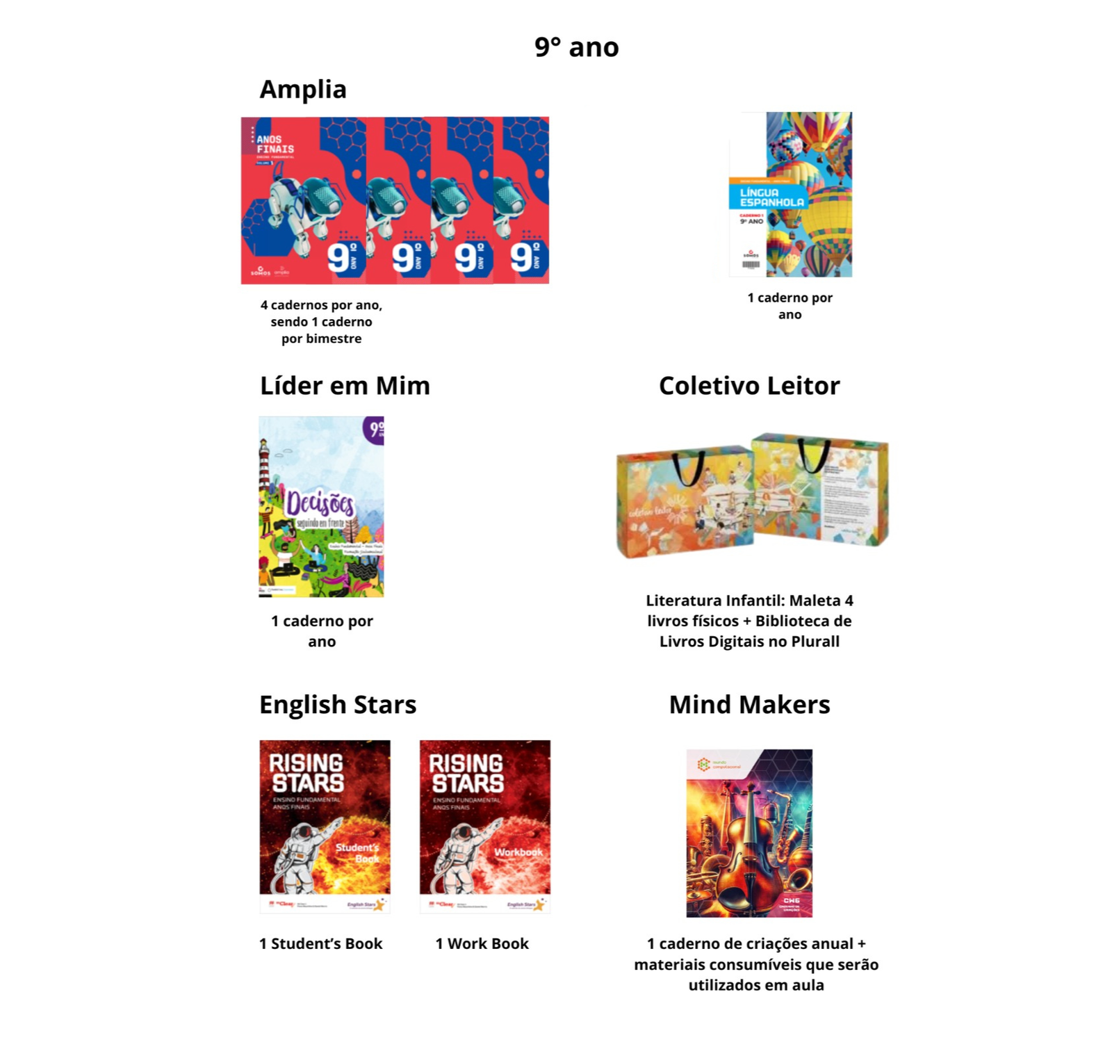 AMPLIA: 4 CADERNOS POR ANO (SENDO 1 POR BIMESTRE) + 1 CADERNO DE LÍNGUA ESPANHOLA + 1 LIVRO DE DESENHO GEOMÉTRICO